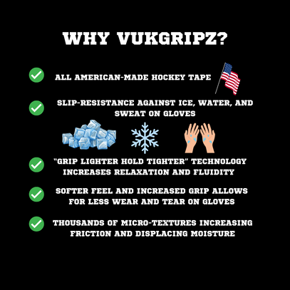Not having a solid grasp on your hockey stick can result in inaccurate passing, bad shooting and missed opportunities! VukGripz has developed a thin hockey tape technology, made up of millions of little bumps that provide gripping power in an unmatched way! Play better no matter the condition!