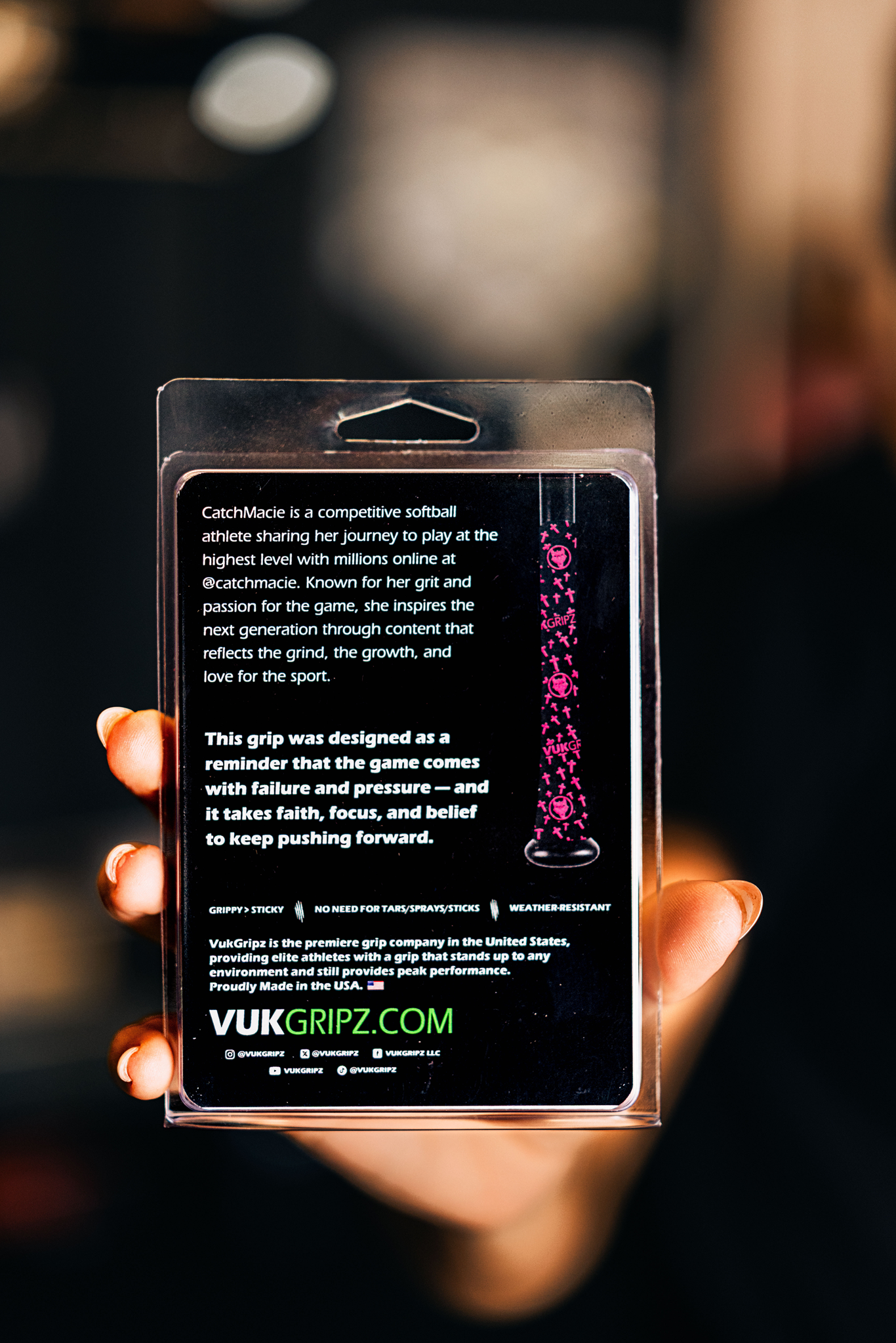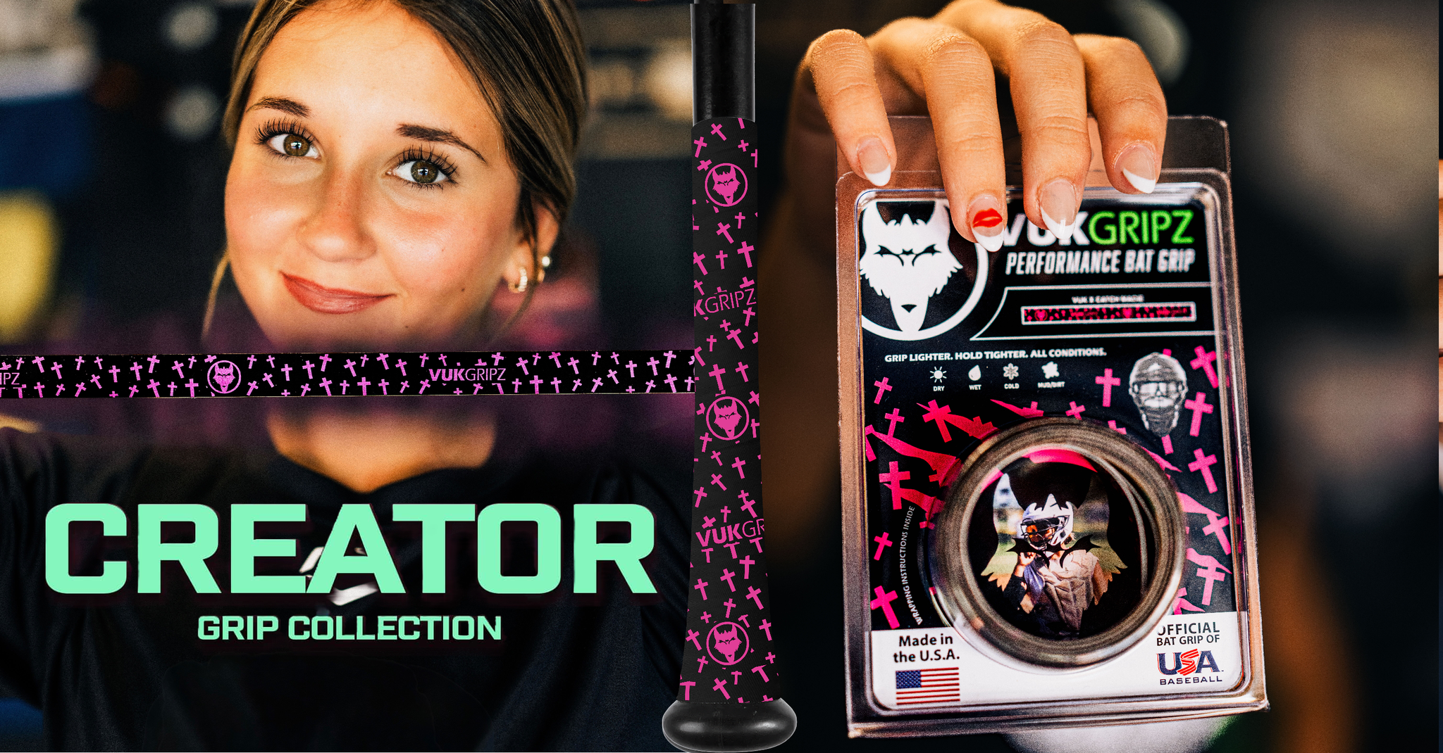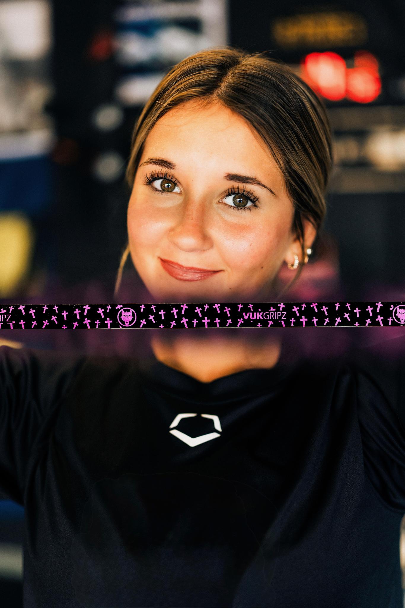 The 4th Creator Series Bat Grip we have launched! This is an epic collab with athlete, CatchMacie! Her unbelievable skill on the field at the plate and behind the dish is not only inspiring, but she is paving the way for athletes! She took her favorite color combo, black and pink, and threw a beautiful faith element to the bat grip utilizing pink crosses throughout! We have a feeling this grip is going to be added to our Faith Collection!